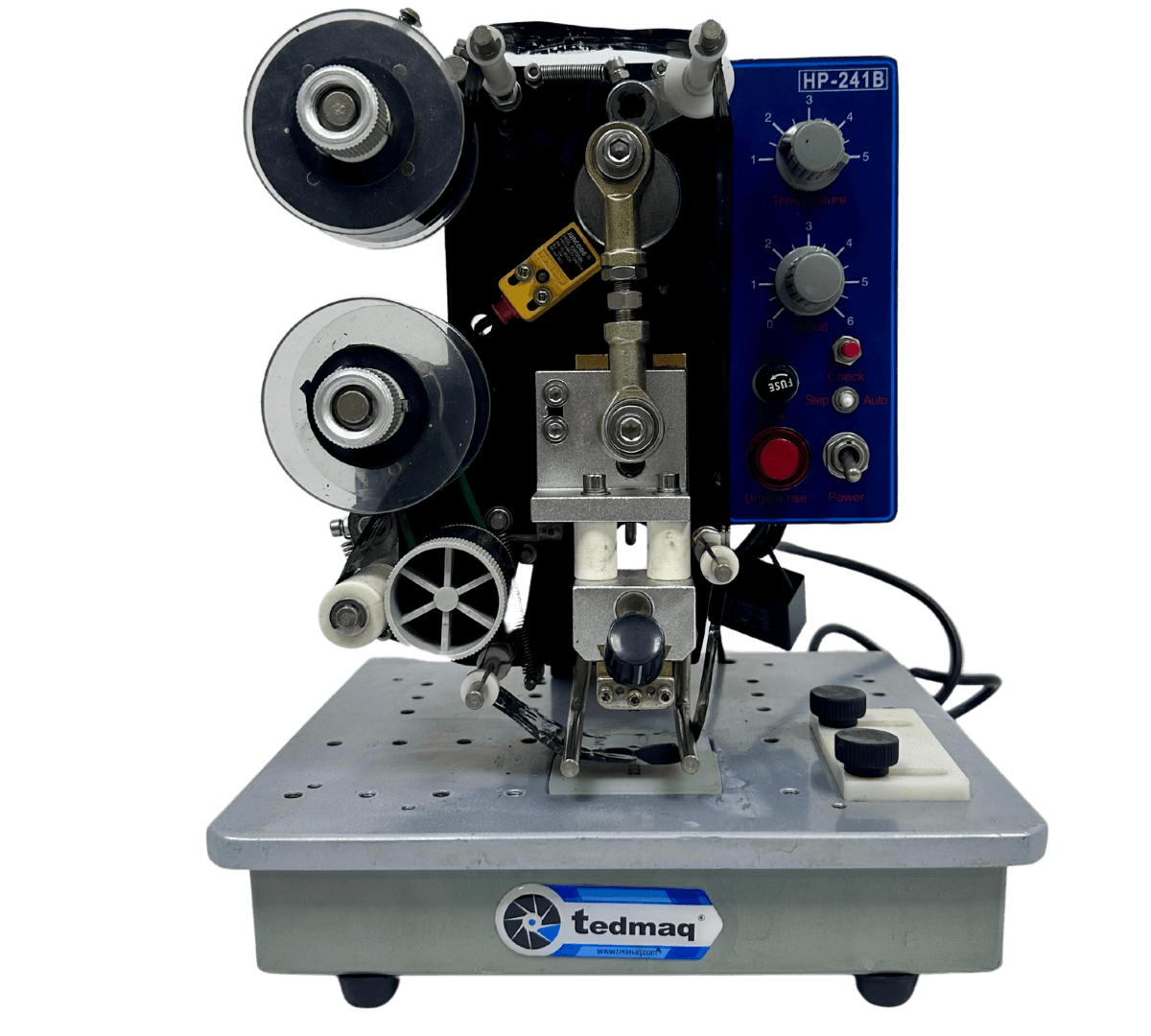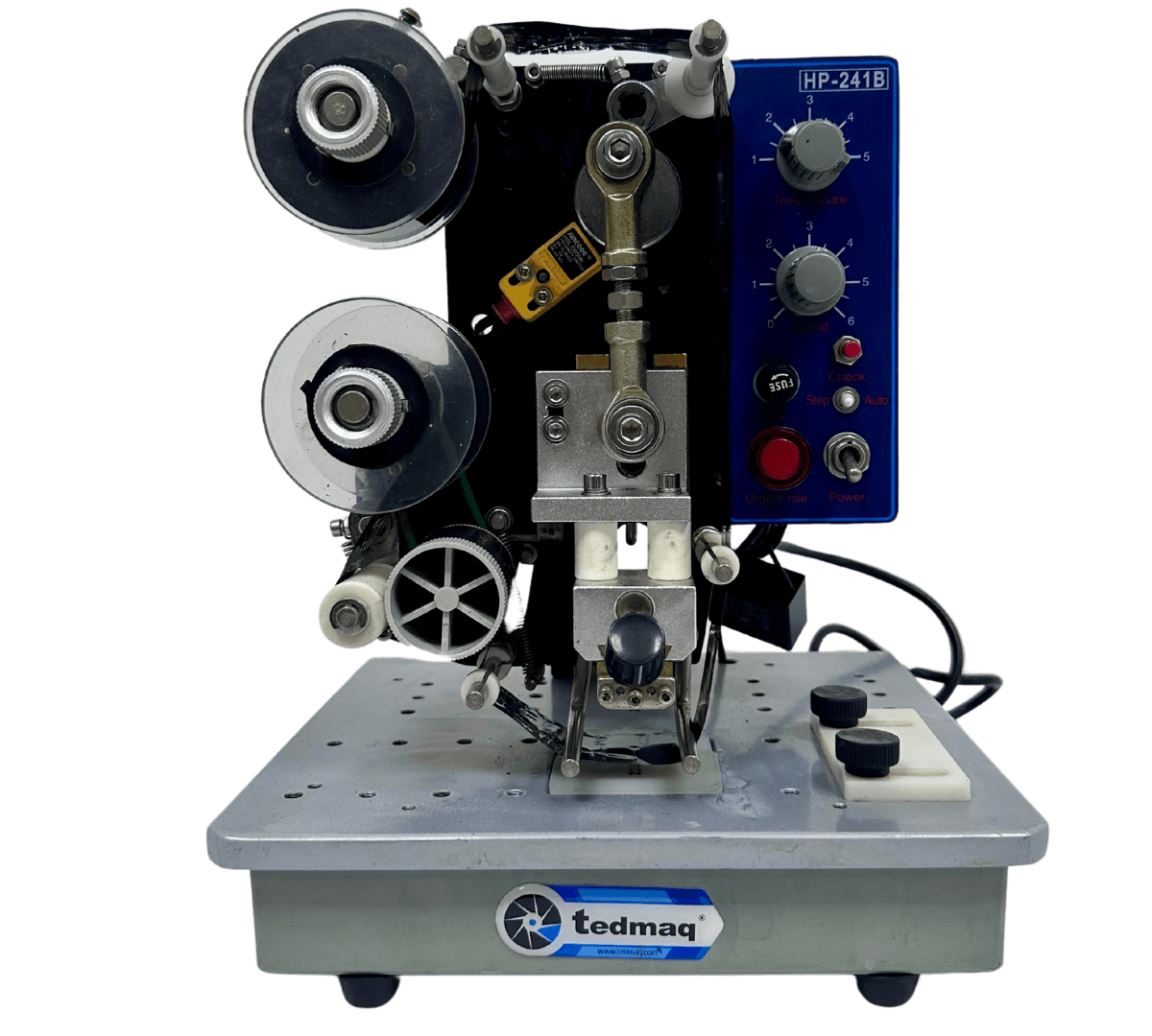 La Codificadora 241 cinta de transferencia térmica es una máquina de sobremesa compacta y fácil de operar, diseñada para imprimir datos variables como fechas de vencimiento, lotes, códigos y más mediante un sistema de cinta de transferencia térmica, que garantiza impresiones limpias, duraderas y de alta calidad.