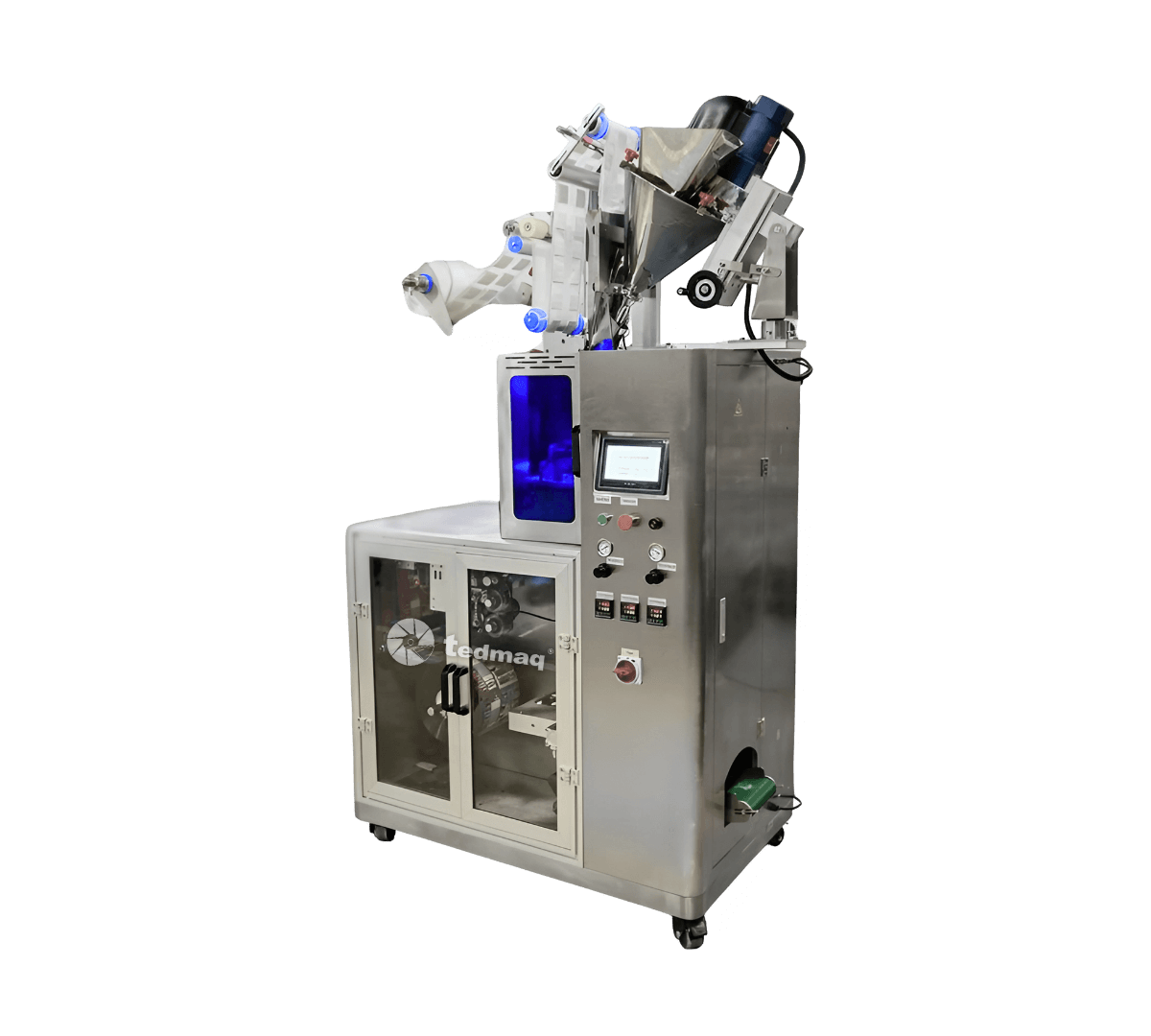 Utiliza sellado ultrasónico para la bolsa interior (filtro de café) y sellado térmico de tres lados para el sobre exterior, asegurando higiene, conservación y una presentación impecable. Su sistema de alimentación por rosca inclinada (slant auger) permite un llenado preciso de entre 8 y 15 gramos por unidad, con una velocidad de hasta 40 bolsas por minuto.