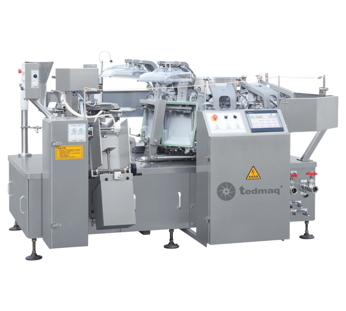 Con 18 estaciones de trabajo dispuestas de forma rotativa, este equipo realiza de manera continua las funciones de alimentación de la bolsa, apertura, dosificación del producto, vacío, sellado y enfriamiento, garantizando un empaque hermético, profesional y prolongando la vida útil del contenido.