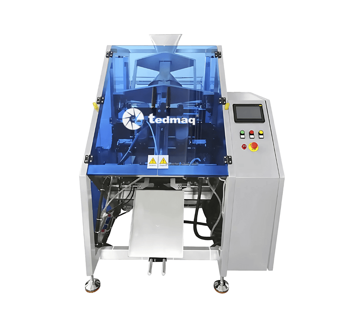 La Empacadora Inclinada, disponible en modelos 420, 520, 620 y 720, es un equipo compacto y eficiente diseñado para automatizar el proceso de envasado, optimizando alimentación, dosificación, embolsado e impresión de fecha y lote en un solo flujo de trabajo.