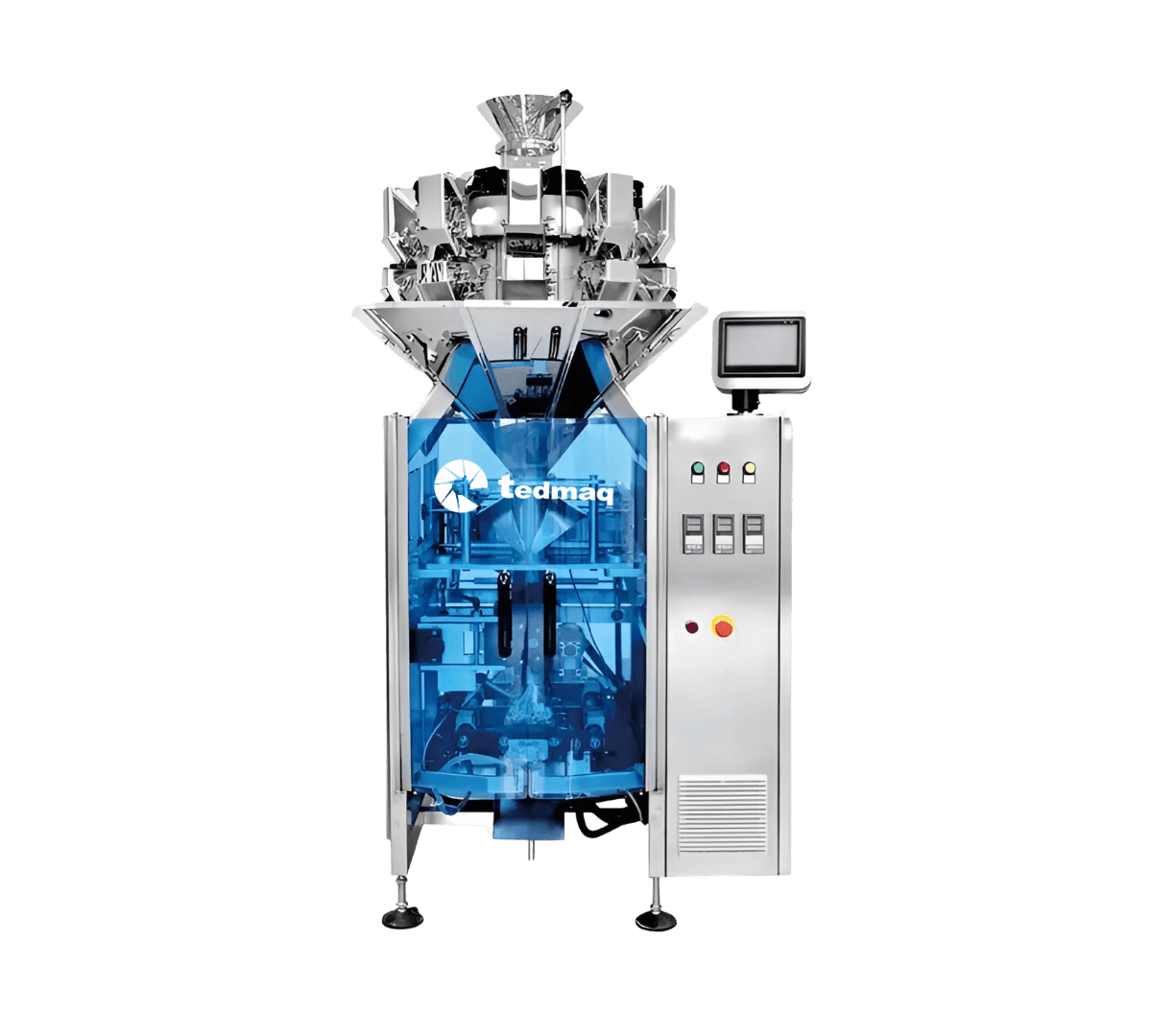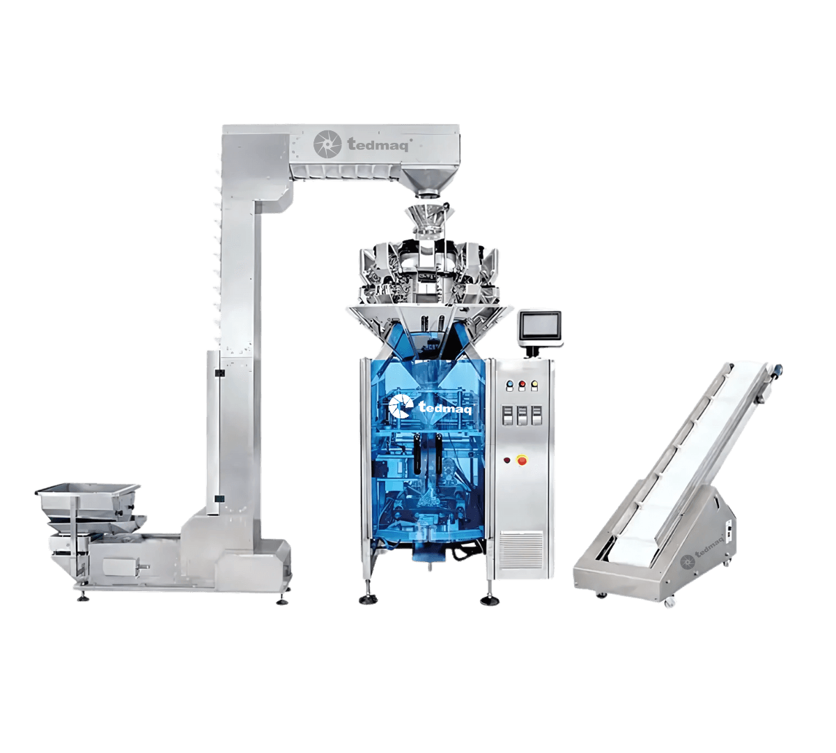 Este sistema integra una empacadora vertical con un multicabezal compacto de alta sensibilidad, lo que permite realizar de forma continua y sin intervención manual las etapas de alimentación del producto, medición por peso, formación de la bolsa, dosificación, sellado, corte e impresión del lote o fecha, garantizando empaque uniforme y alta productividad.