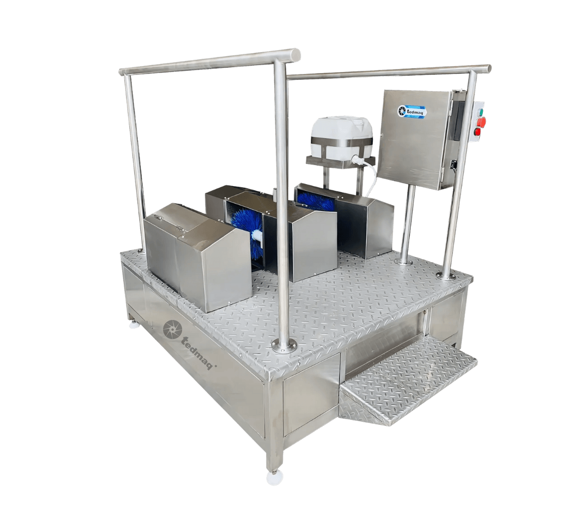 El Lavabotas de Paso Continuo para espacios cortos ha sido diseñado especialmente para plantas donde el espacio es limitado pero el control de inocuidad es crítico. Este equipo permite la limpieza automática de botas bajas y suelas sin necesidad de detener el paso del personal, optimizando la operación incluso en áreas de difícil instalación.