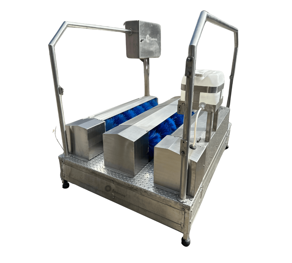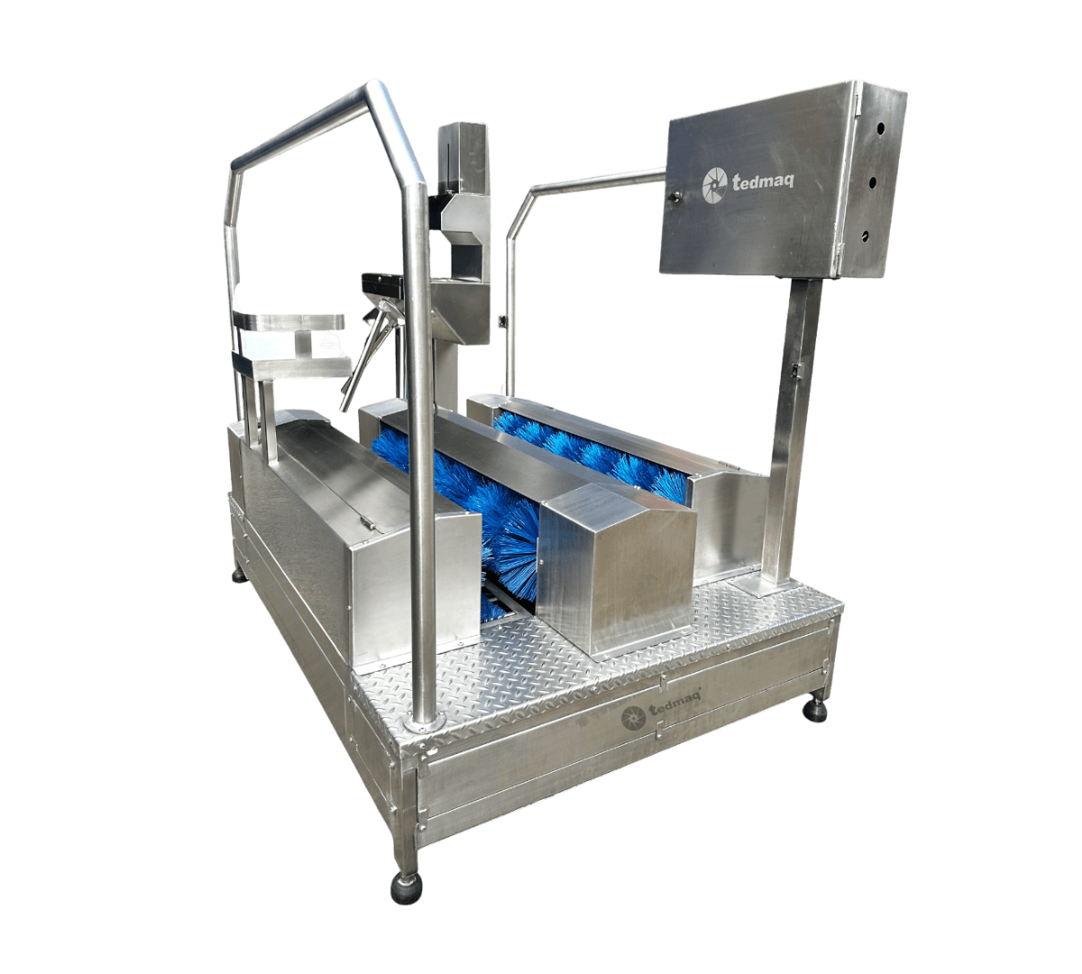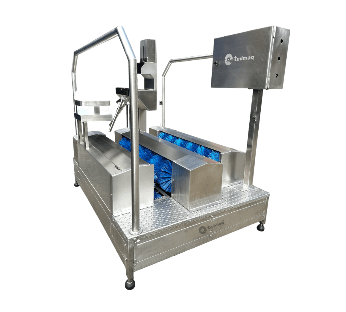 El Lavabotas de Paso Continuo es un equipo diseñado para garantizar la limpieza eficiente de suelas y botas bajas, permitiendo el paso continuo del personal sin detener el flujo operativo. Gracias a su accionamiento automático mediante sensores, el sistema se activa al detectar el ingreso del usuario, iniciando el proceso de limpieza de forma inmediata. Además, su diseño bidireccional permite el uso en ambos sentidos de circulación, ideal para zonas de alto tránsito.