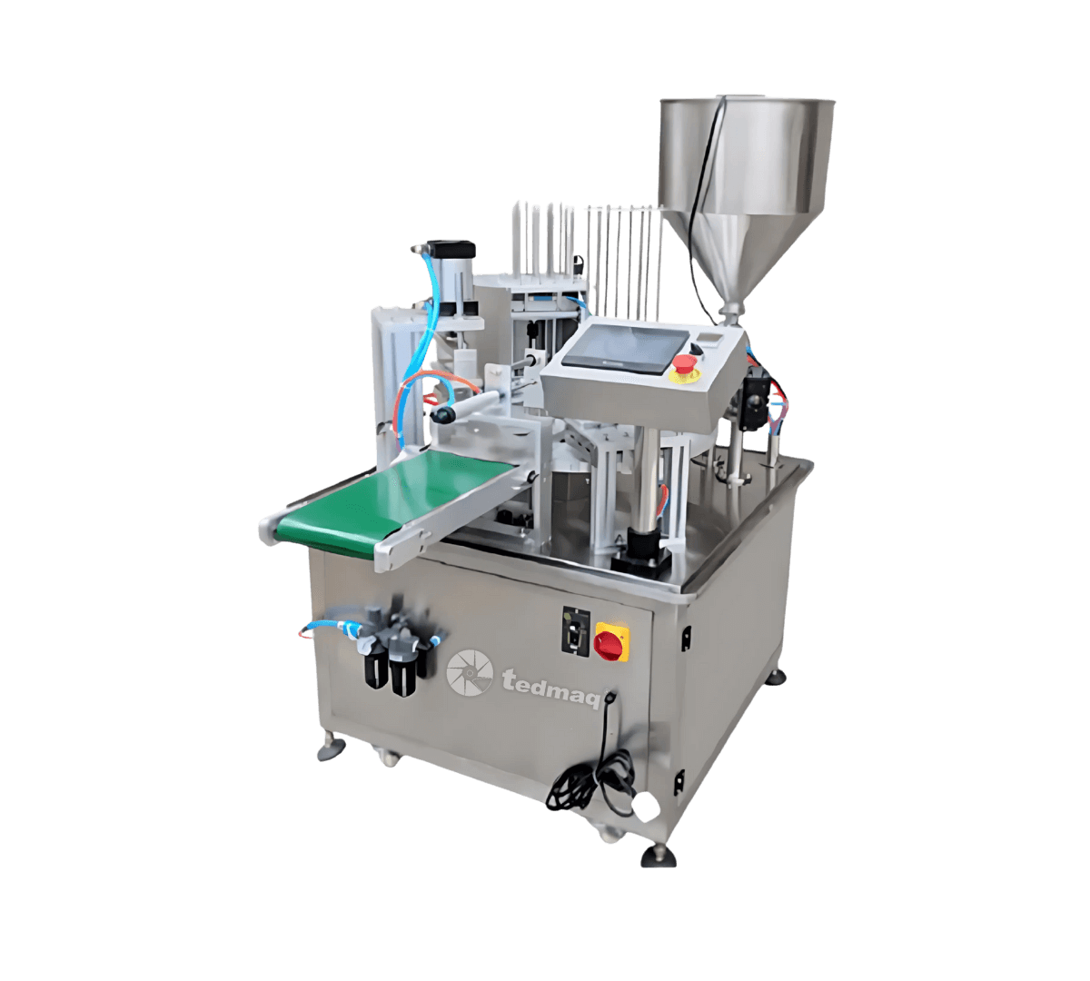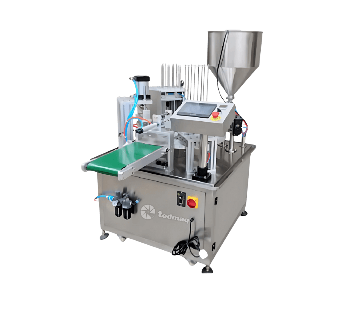 La Llenadora y Selladora de Vasos Rotativo TEDMAQ es una máquina versátil y de alta tecnología, diseñada para automatizar el proceso de suministro, llenado, dispensado de foil o plástico y sellado de vasos en un solo ciclo continuo. Su sistema rotativo garantiza velocidad, eficiencia y uniformidad en el envasado, optimizando la productividad de las líneas industriales de alimentos y bebidas.