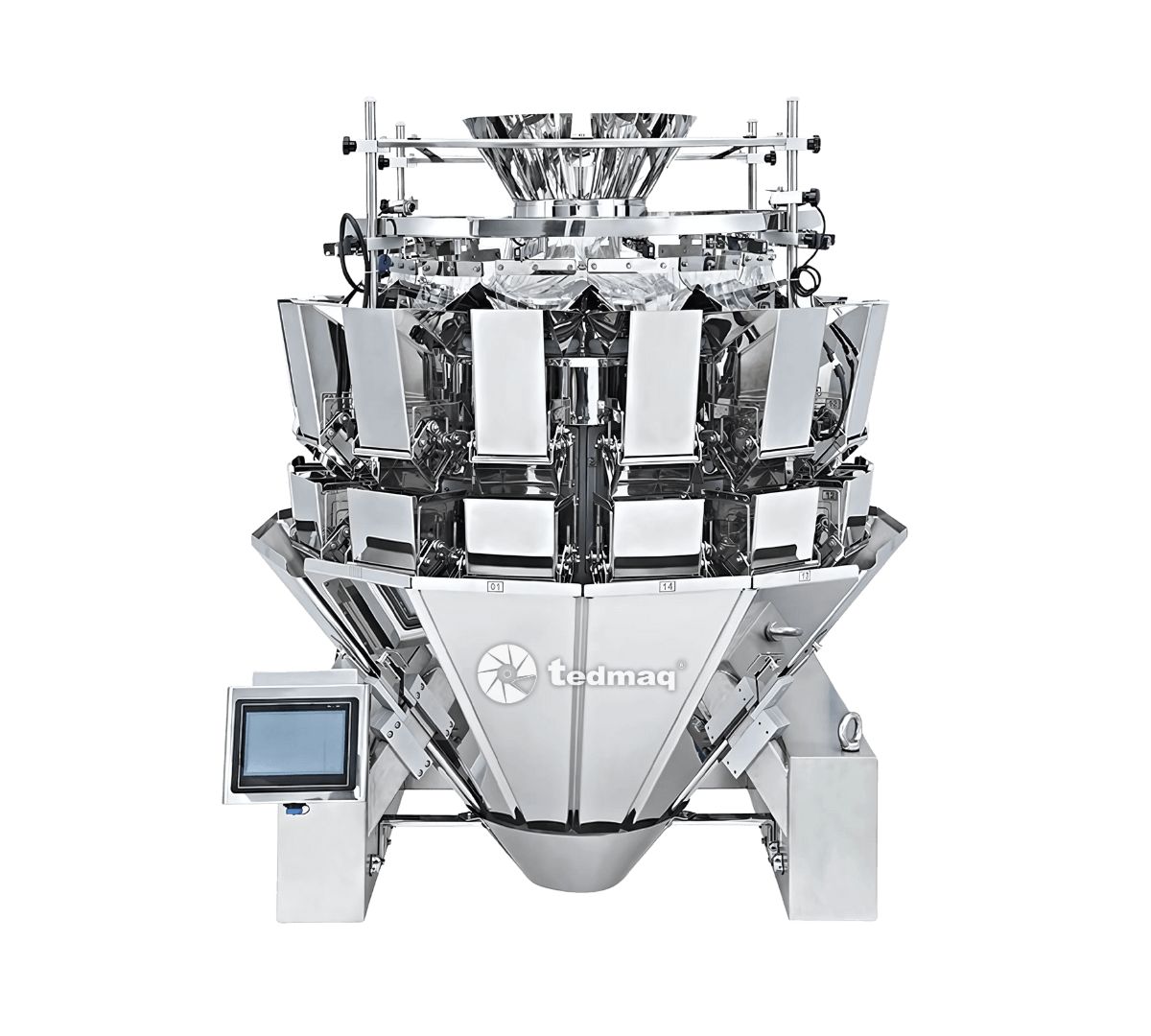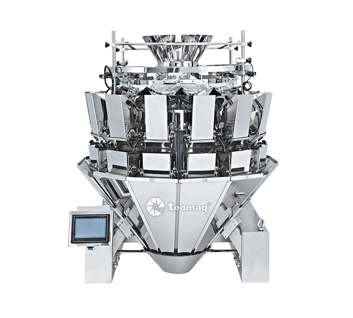 El Multicabezal 14 Pesadores es una máquina dosificadora compacta y de alta velocidad, diseñada para realizar el proceso completo de alimentación, pesaje y descarga de productos granulares o de flujo libre con máxima precisión.