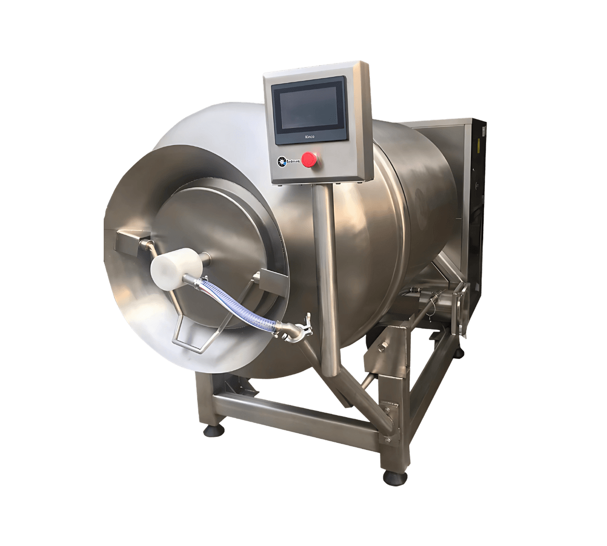El Tumbler, disponible en capacidades de 100, 200, 300, 400, 500, 600, 700, 1000 y 2500 litros, está diseñado para optimizar los procesos de masaje, marinado y absorción de salmueras en productos cárnicos, mediante un sistema de rotación controlada en vacío que mejora la textura, el color y el rendimiento del producto final.
