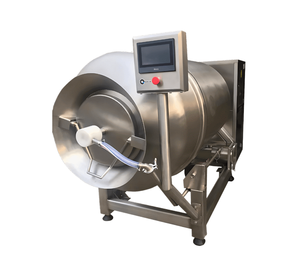 Un tombler es una máquina utilizada principalmente en la industria cárnica y alimentaria para mejorar la absorción de ingredientes, la textura y la jugosidad de los productos a través de un proceso de masajeado controlado. Funciona generando un vacío parcial y movimientos rotacionales que permiten que la carne absorba salmuera, especias y otros ingredientes de manera uniforme, mejorando la estructura y evitando pérdidas de líquidos durante la cocción. Su uso es esencial en la producción de embutidos, jamones, carnes marinadas y productos listos para cocinar, asegurando un producto final más tierno, jugoso y con mejor sabor.